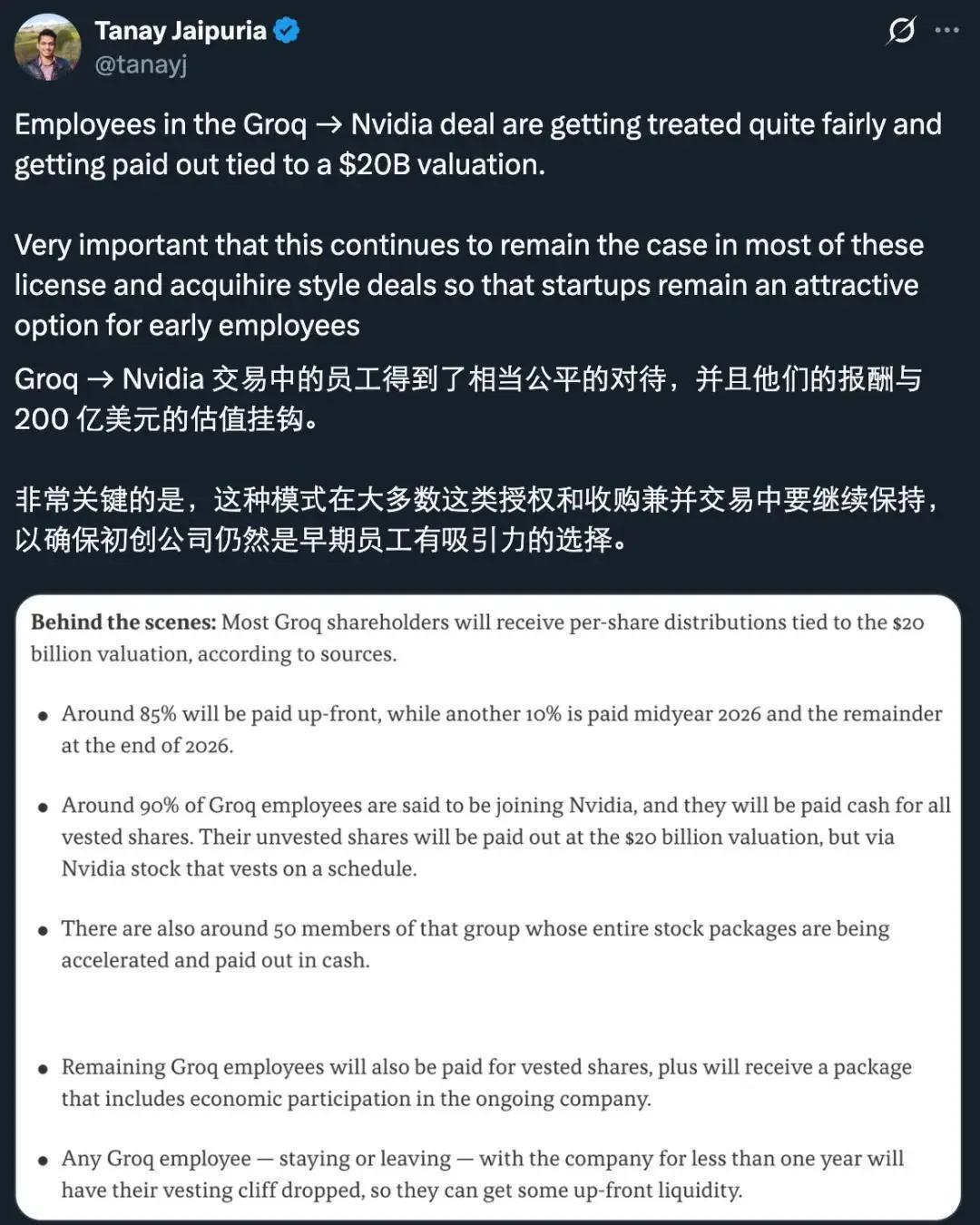 值得注意的是,交易还设置了特别保护条款:无论去留,任职不满一年的 Groq 员工将被免除股权归属的「悬崖期」限制,确保其能够获得一定的即时流动性。